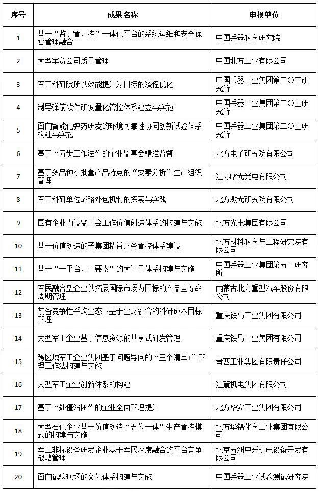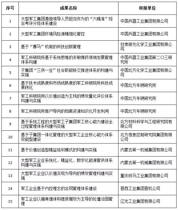近日,中國兵器工業(yè)集團(tuán)4項(xiàng)創(chuàng)新成果獲全國企業(yè)管理現(xiàn)代化創(chuàng)新成果獎(jiǎng)、42項(xiàng)創(chuàng)新成果獲國防科技工業(yè)企業(yè)管理創(chuàng)新成果獎(jiǎng)。 全國企業(yè)管理現(xiàn)代化創(chuàng)新成果 經(jīng)全國企業(yè)管理現(xiàn)代化創(chuàng)新成果審定委員會終審,第二十五屆全國企業(yè)管理現(xiàn)代化創(chuàng)新成果公布,中國兵器工業(yè)集團(tuán)4項(xiàng)創(chuàng)新成果榮獲二等獎(jiǎng)。 二等獎(jiǎng) 國防科技工業(yè)企業(yè)管理創(chuàng)新成果 2018年度國防科技工業(yè)企業(yè)管理創(chuàng)新獲獎(jiǎng)成果名單發(fā)布,中國兵器工業(yè)集團(tuán)共獲獎(jiǎng)42項(xiàng),其中:一等獎(jiǎng)7項(xiàng),二等獎(jiǎng)15項(xiàng),三等獎(jiǎng)20項(xiàng)。獲獎(jiǎng)總量及一等獎(jiǎng)數(shù)量均位于軍工集團(tuán)首位。 一等獎(jiǎng) 二等獎(jiǎng) 三等獎(jiǎng) 據(jù)悉,2018年度的國防科技工業(yè)企業(yè)管理創(chuàng)新評審工作,經(jīng)專家初審、函審、一等獎(jiǎng)候選成果答辯、專家會議評審、評審委員會審核并公示后,評選出一批在履行強(qiáng)軍首責(zé)、全面貫徹創(chuàng)新驅(qū)動發(fā)展戰(zhàn)略和全面深化改革、高質(zhì)量發(fā)展等方面的優(yōu)秀成果。本年度共確定獲獎(jiǎng)成果307項(xiàng),其中一等獎(jiǎng)44項(xiàng),二等獎(jiǎng)126項(xiàng),三等獎(jiǎng)137項(xiàng)。 |
