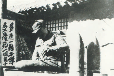 ▲抗日戰(zhàn)爭(zhēng)時(shí)期,晉察冀軍區(qū)技術(shù)人員在拆卸炮彈。旁邊的標(biāo)語(yǔ)為:多造一粒子彈,多殺死一個(gè)鬼子