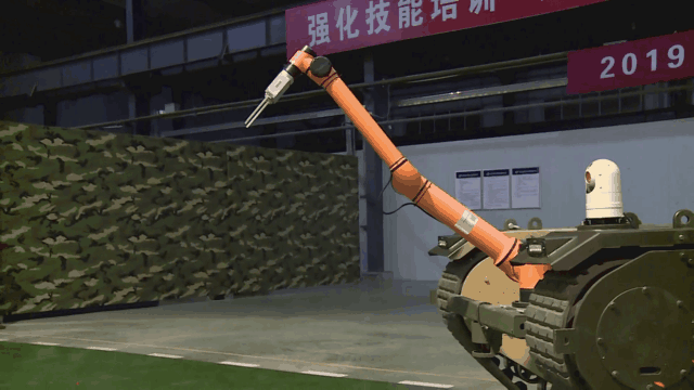 搭載機(jī)械手的多功能模塊化履帶無人平臺,就像一個(gè)靈活的機(jī)器人,面對地上的障礙物,利用機(jī)械手將抓取到的危險(xiǎn)物品,穩(wěn)穩(wěn)地投擲到防爆倉里,在現(xiàn)場無人操控的情況下,圓滿完成應(yīng)急救援任務(wù)。